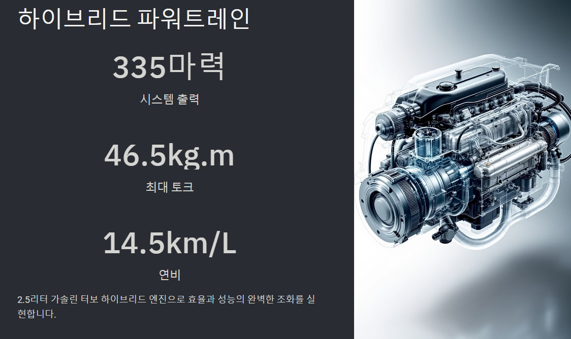 2.5리터 가솔린 터보 하이브리드 모델의 예상 연비는 14.5km/L로, 대형 SUV 중에서도 높은 효율을 자랑합니다.