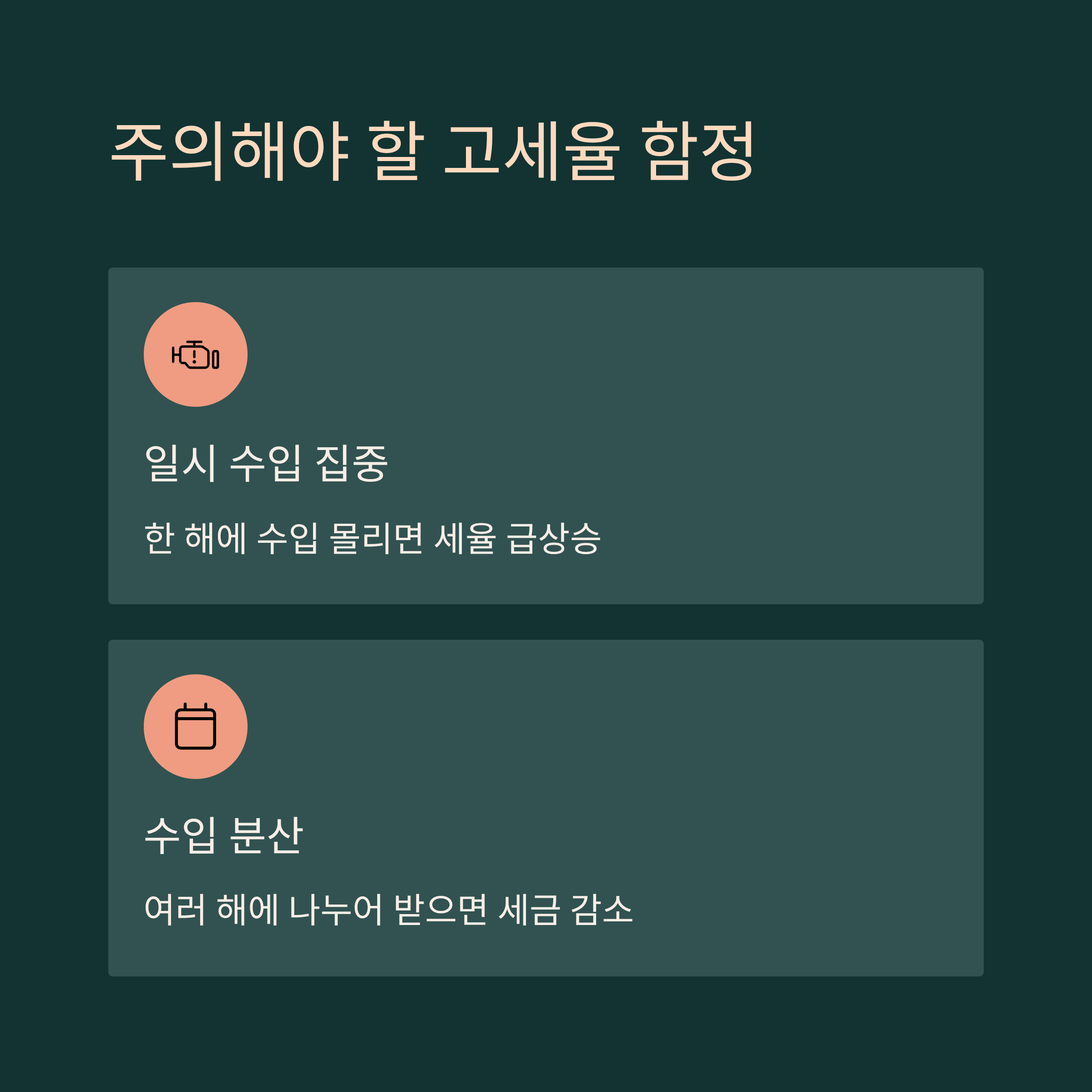 또한 갑자기 큰 수익이 생겼을 때 '분할 수익 처리'를 고려하지 않으면 한 해 몰아서 고세율 구간에 진입하게 돼요. 투자나 부동산 매각 시기 조정, 수익 인식 분산이 중요한 이유예요.