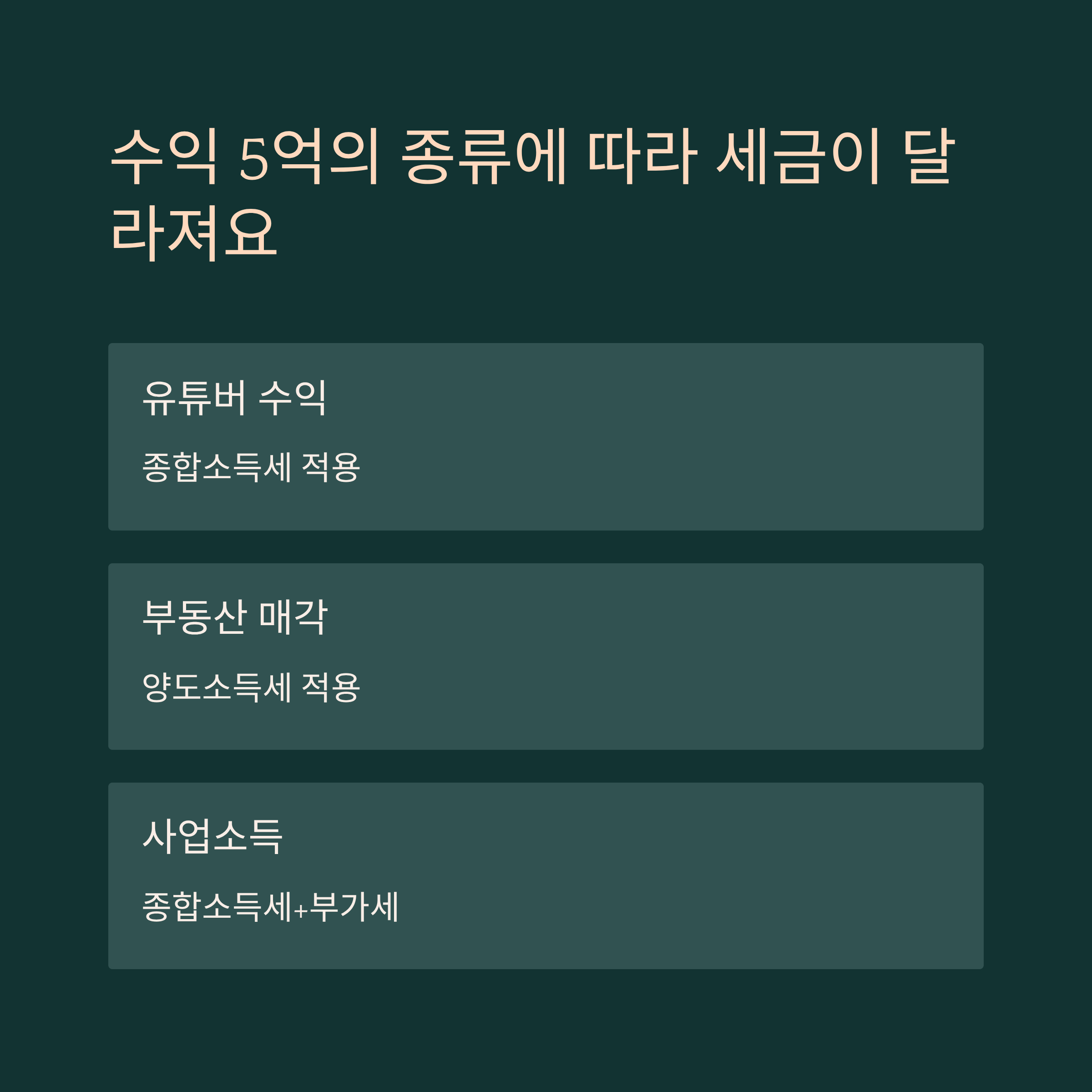 세금은 수익의 “종류”에 따라 완전히 다르게 부과돼요. 5억 원을 벌었다고 해서 누구나 똑같은 세율을 적용받는 게 아니에요. 그래서 “어떻게 벌었느냐”가 세금의 핵심이에요!