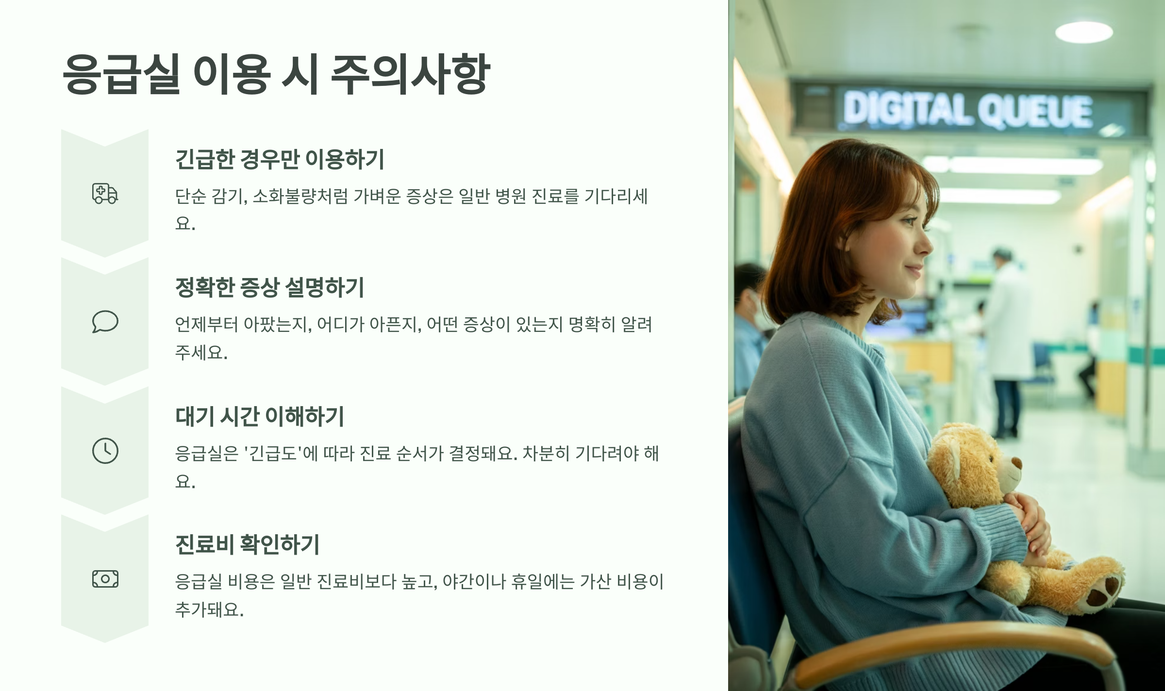 세 번째는 대기 시간이 길 수 있다는 걸 이해하는 마음이에요. 응급실은 '긴급도'에 따라 진료 순서가 결정되기 때문에, 아무리 먼저 도착했더라도 상태가 덜 심각하면 후순위로 밀릴 수 있어요. 의료진을 믿고 차분히 기다려야 해요.