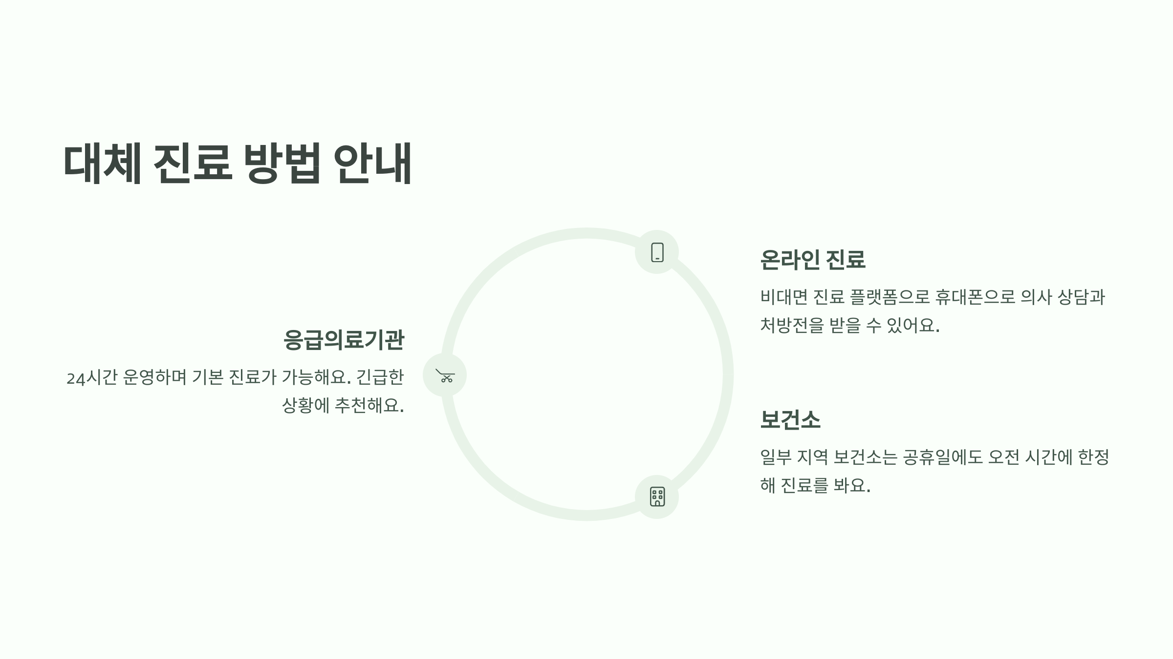 | 온라인 진료 | 앱으로 간편 상담 | 경증, 비응급 질환 |